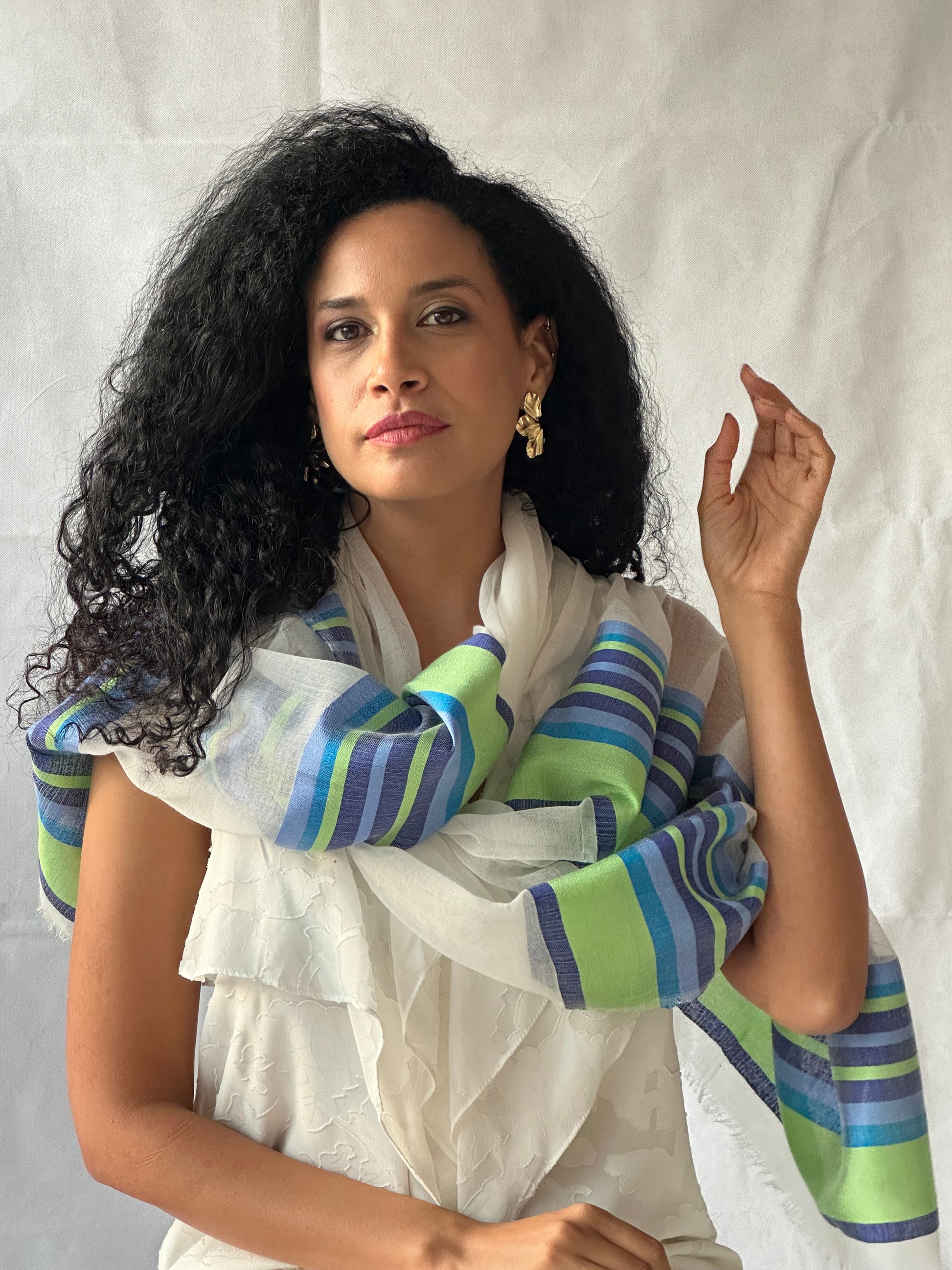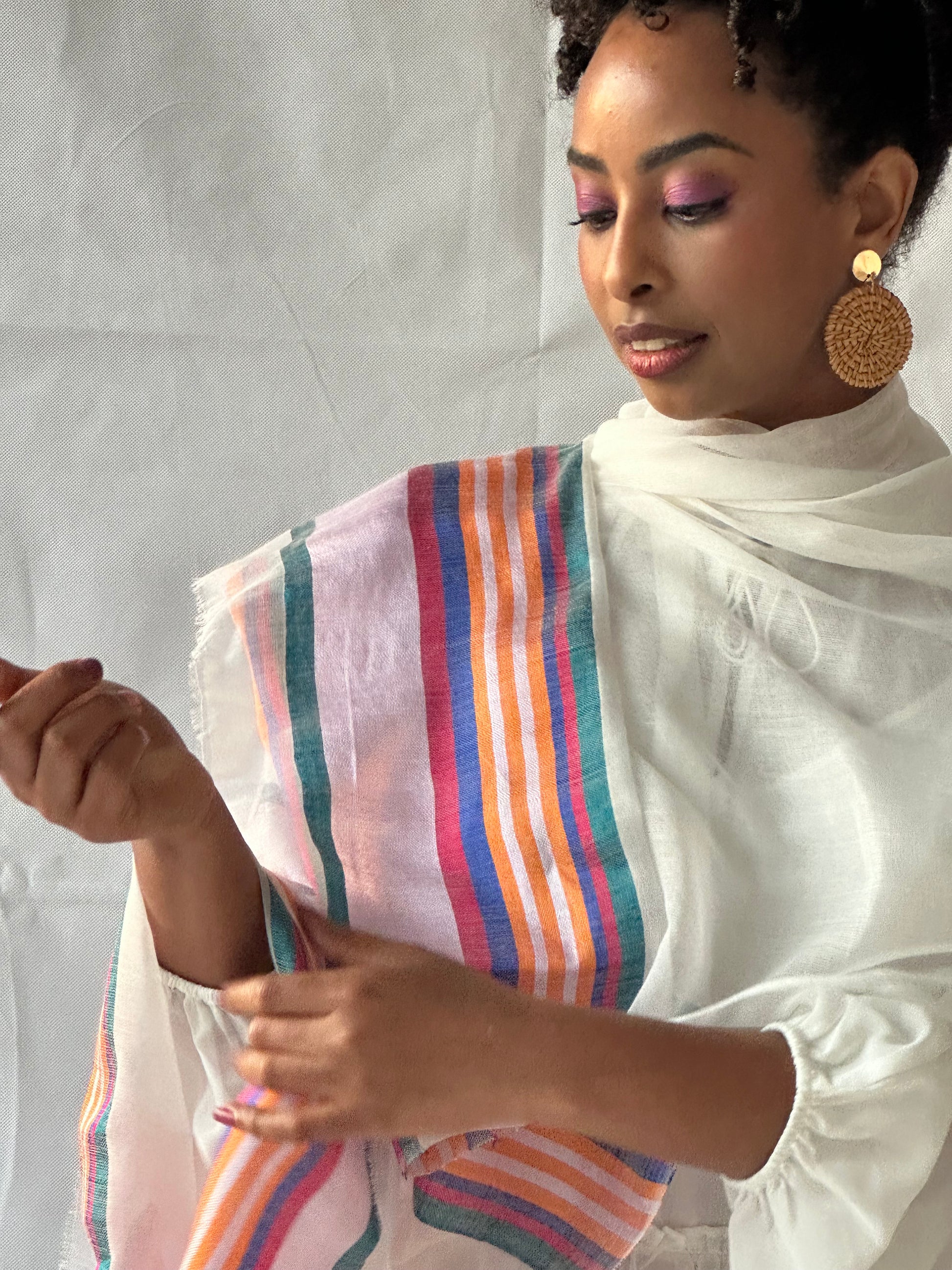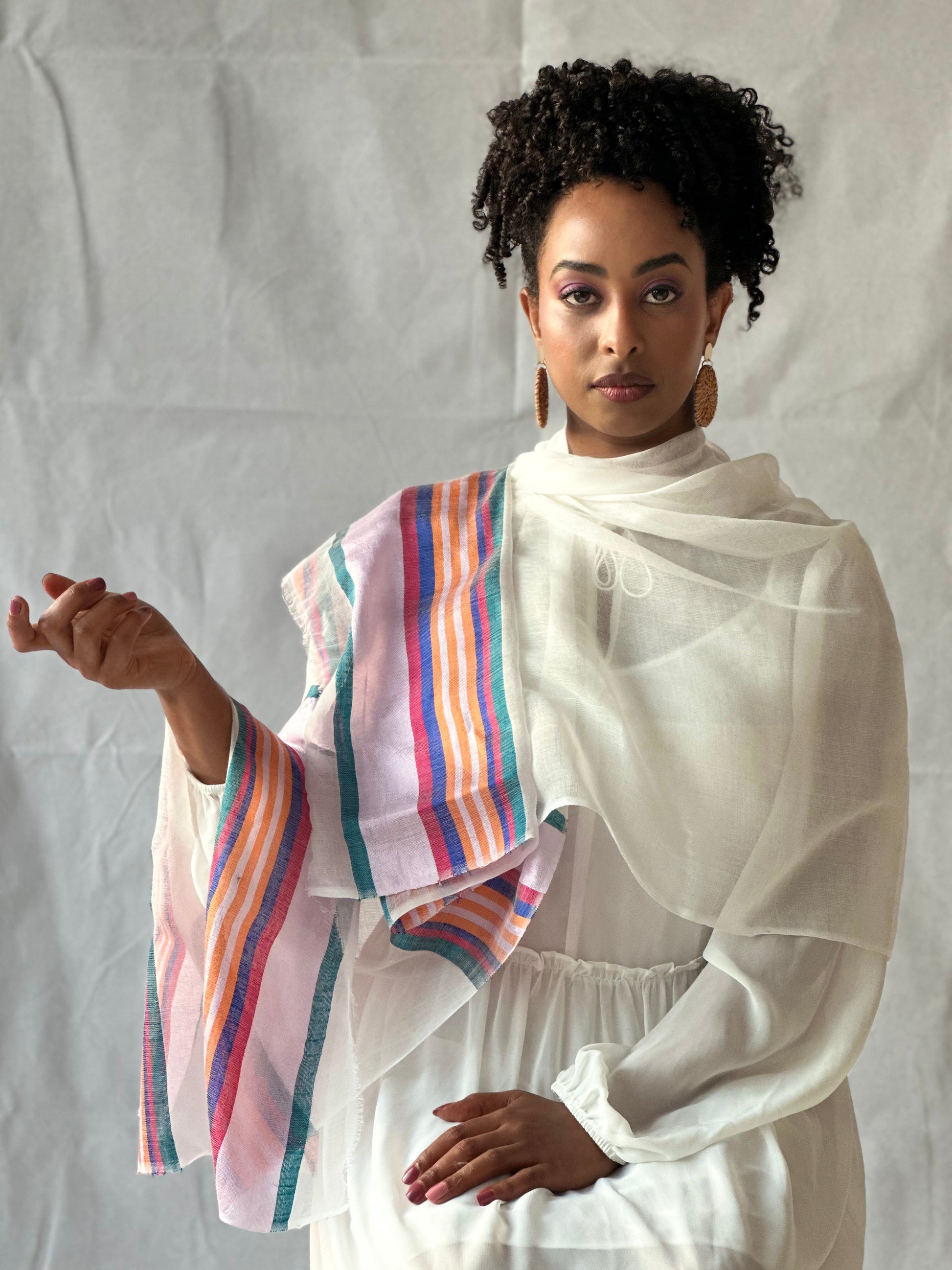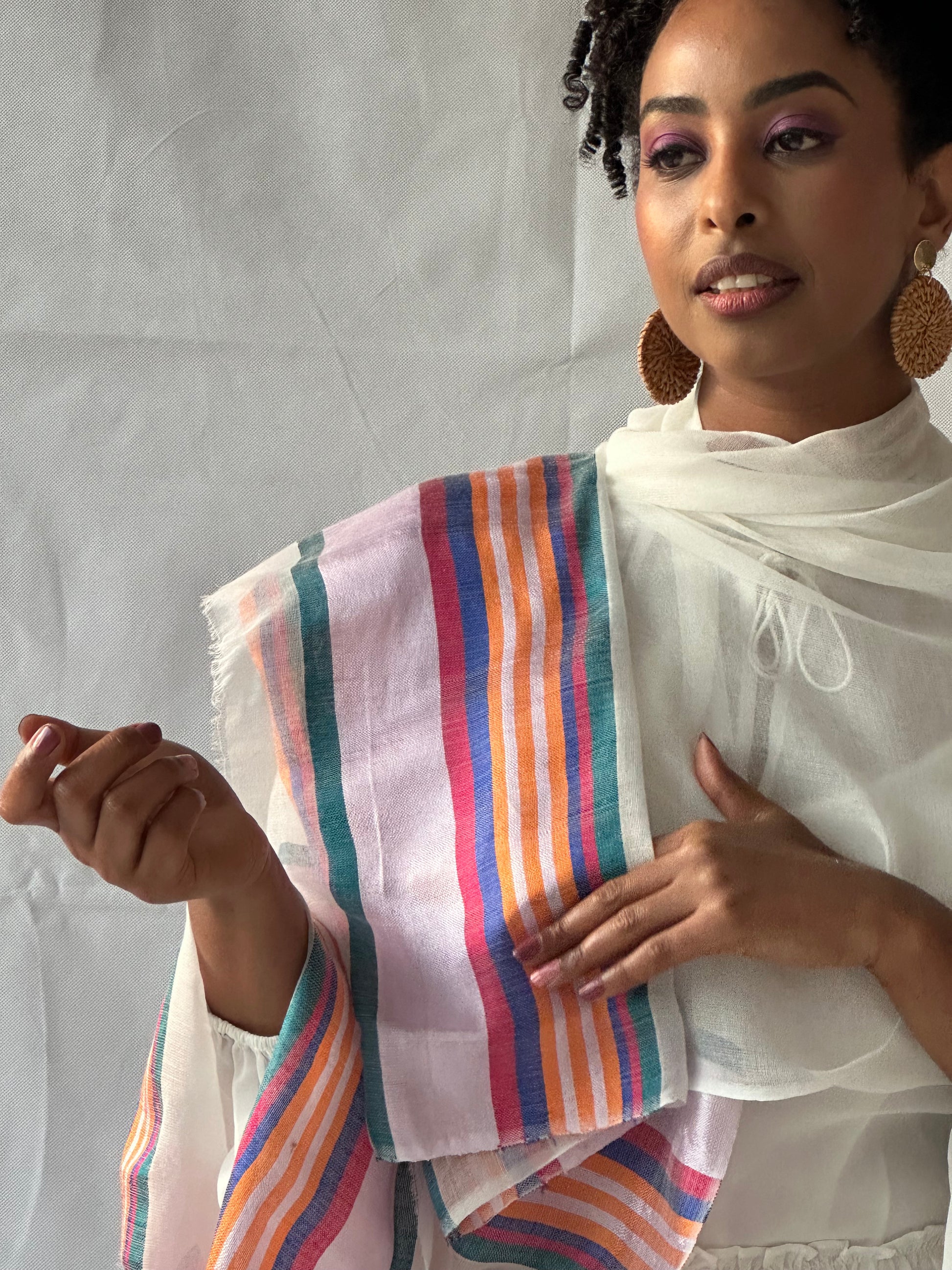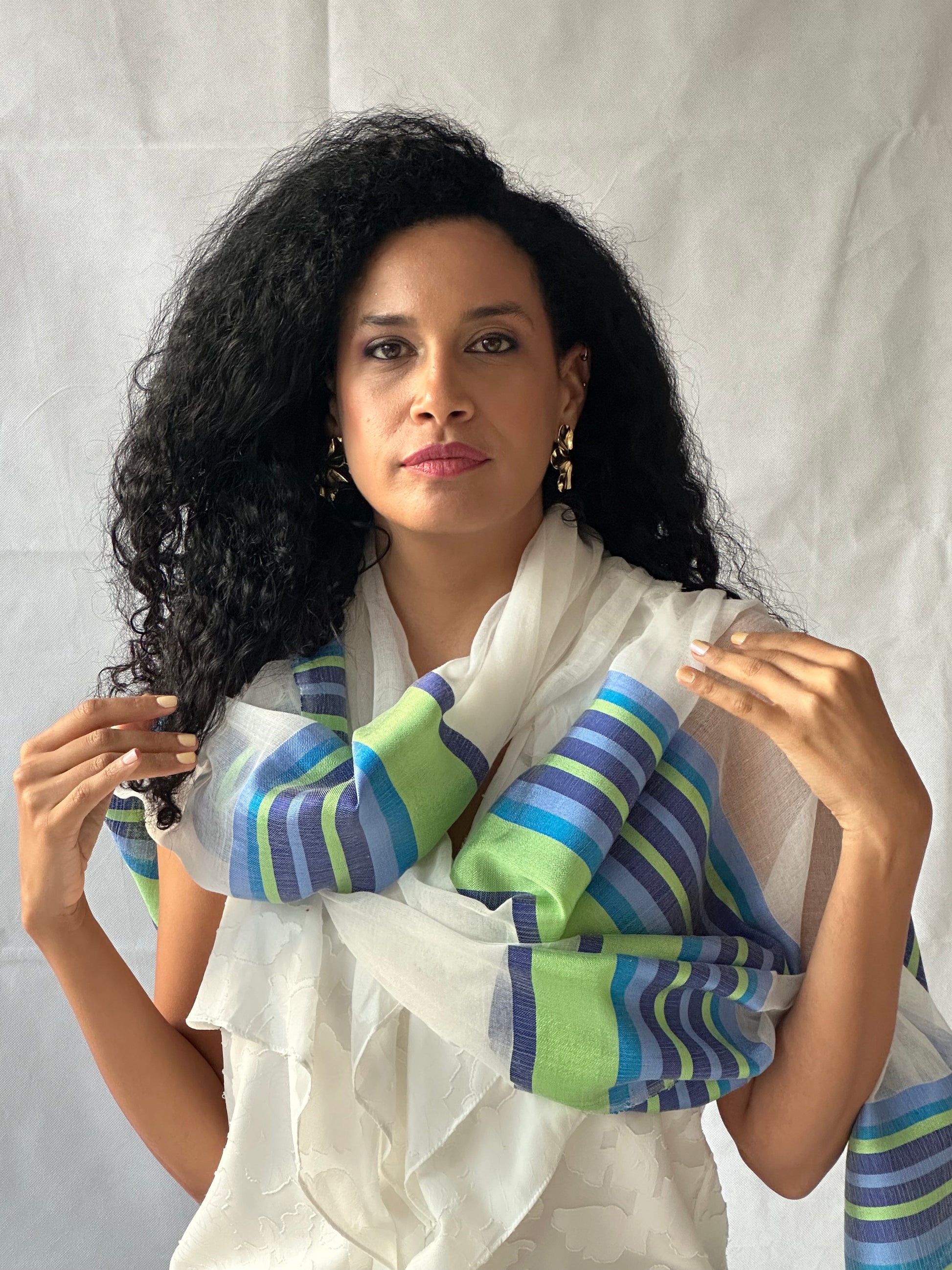 Accented with Saba thread colors, these scarves feature vibrant hues and intricate patterns that reflect Ethiopia’s rich cultural identity. Lightweight yet cozy, they’re perfect for layering year-round—whether you’re dressing up a simple outfit or adding meaning to your everyday style.